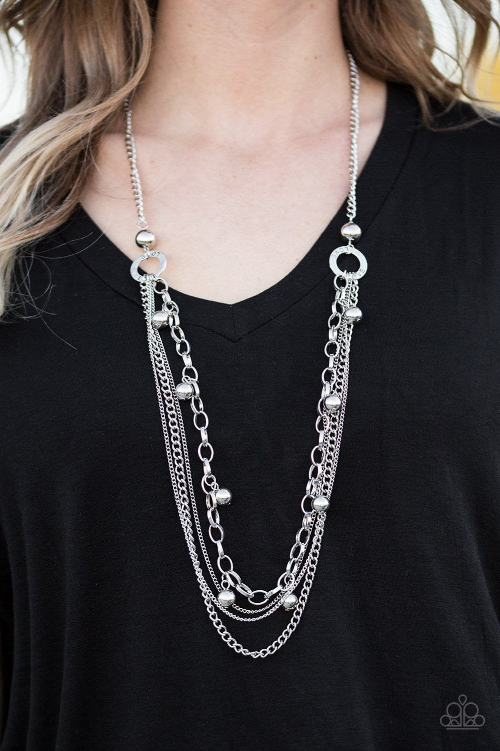 Stamped in the word “love,” two shimmery silver hoops give way to a mishmash of silver chains. Infused with bold silver links, classic silver beads swing from the bottom of the chain, creating a whimsical fringe. Features an adjustable clasp closure.