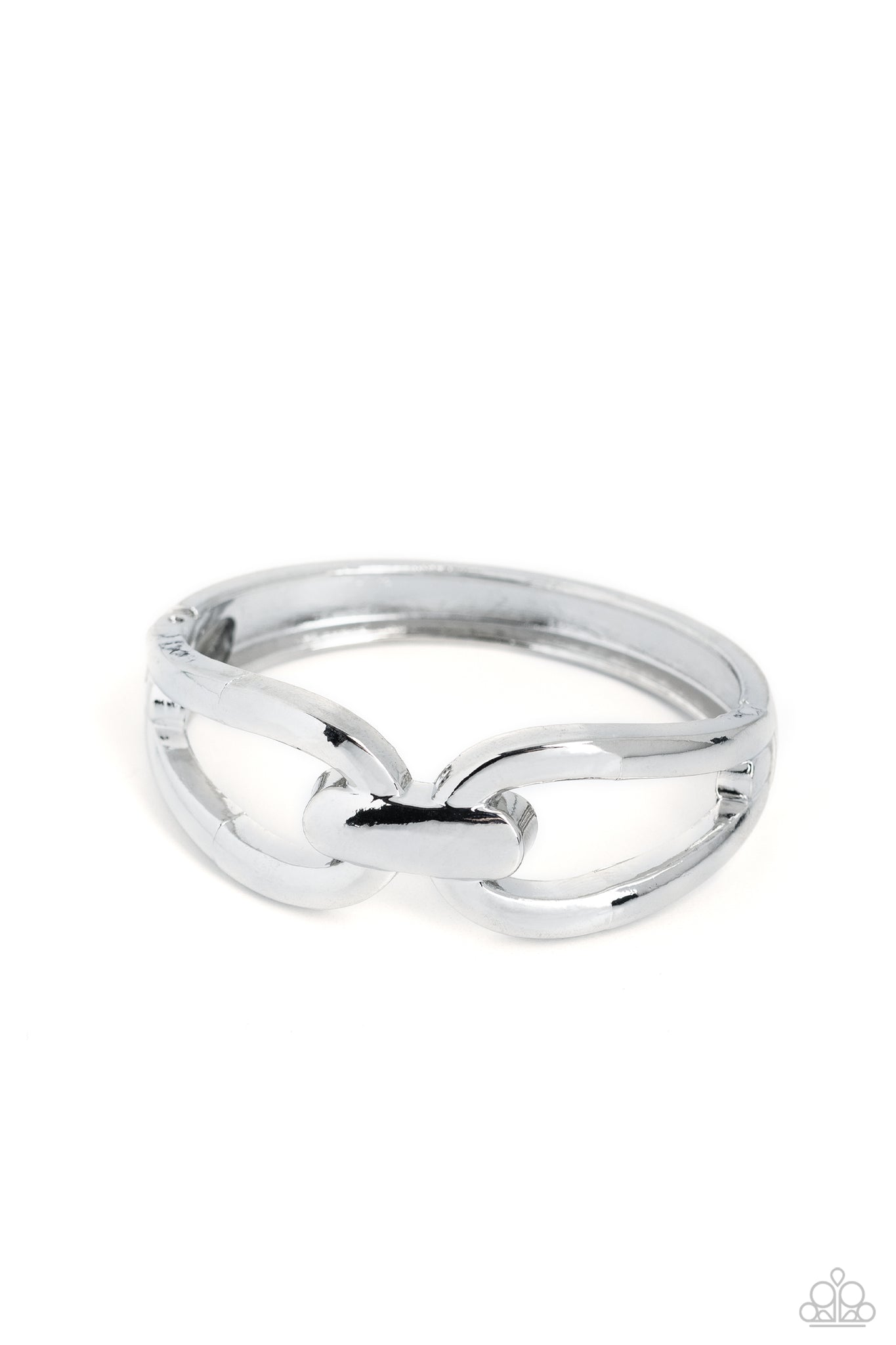 Featuring a masquerade-like motif, an airy silver frame meets around the wrist, creating an oversized cuff-like bangle. A thick overlay of silver connects the two loops for additional industrial detail. Features a hinged closure.