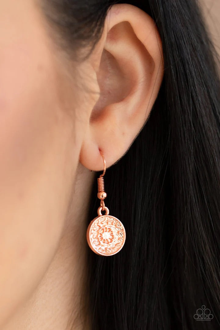 Embossed in a glistening floral pattern, dainty shiny copper medallion-like frames gradually increase in size as they trickle from the bottoms of five layered chains for a whimsical look. Features an adjustable clasp closure.