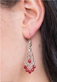 Faceted red beads swing from the top and bottom of a dainty silver frame, creating a glamorous fringe. A dainty white rhinestone adorns the top of the frame for a refined finish. Earring attaches to a standard fishhook fitting.