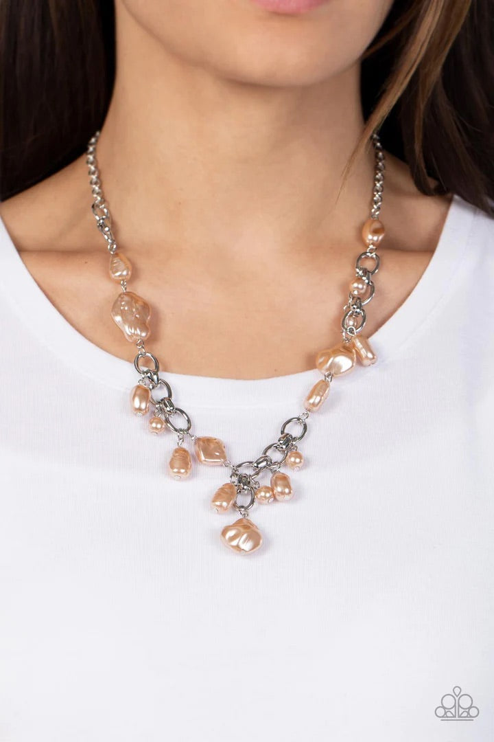 A modern collection of asymmetrical pearly brown beads adorn sections of a chunky silver chain below the collar. Matching pearly beads sporadically trickle from the chain, resulting in a timelessly tasseled display. Features an adjustable clasp closure.