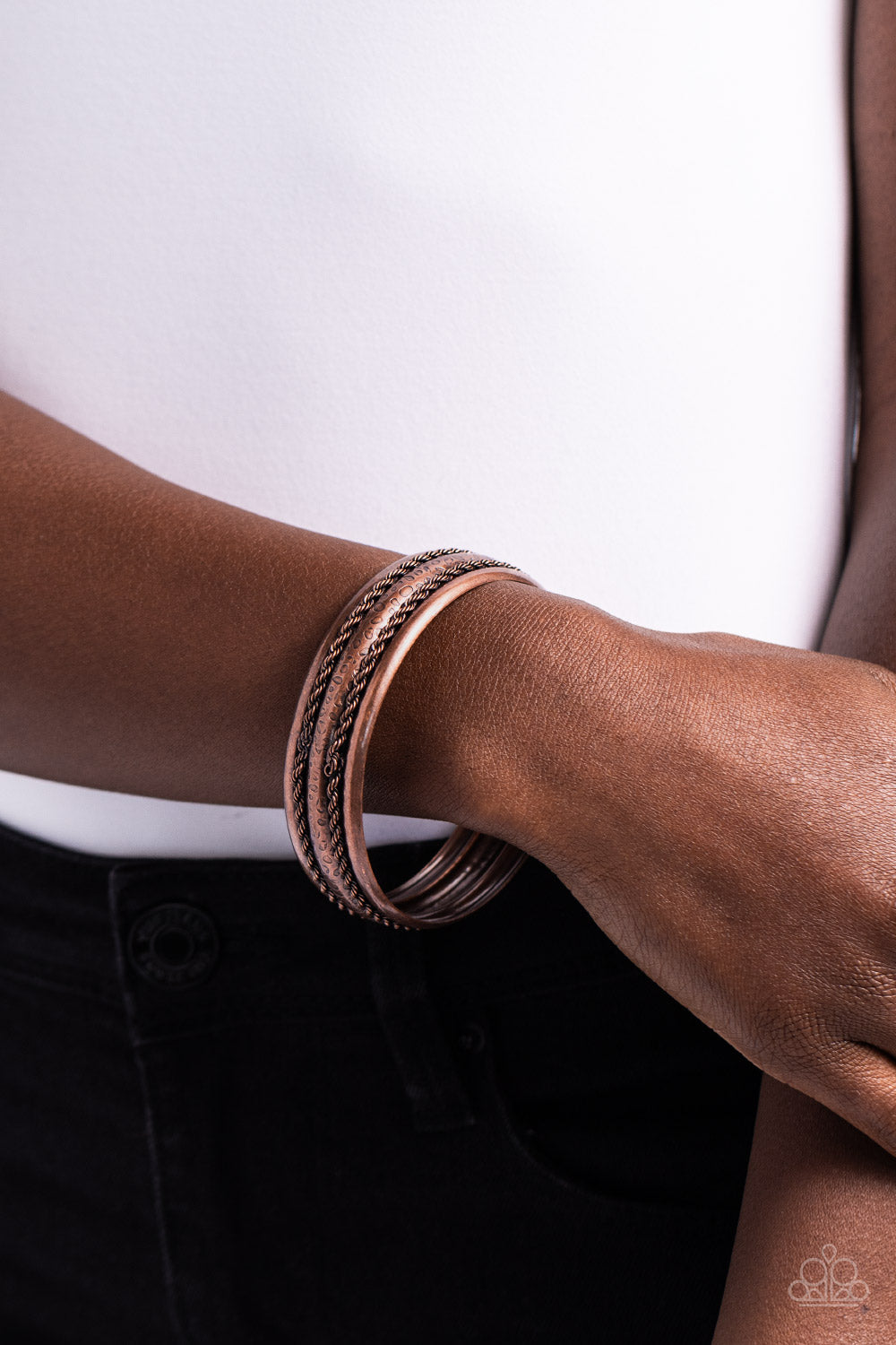 Two rows of twisted copper rope-like cords wrap around a thick copper bangle stamped in a row of antiqued texture for a rustic flair.