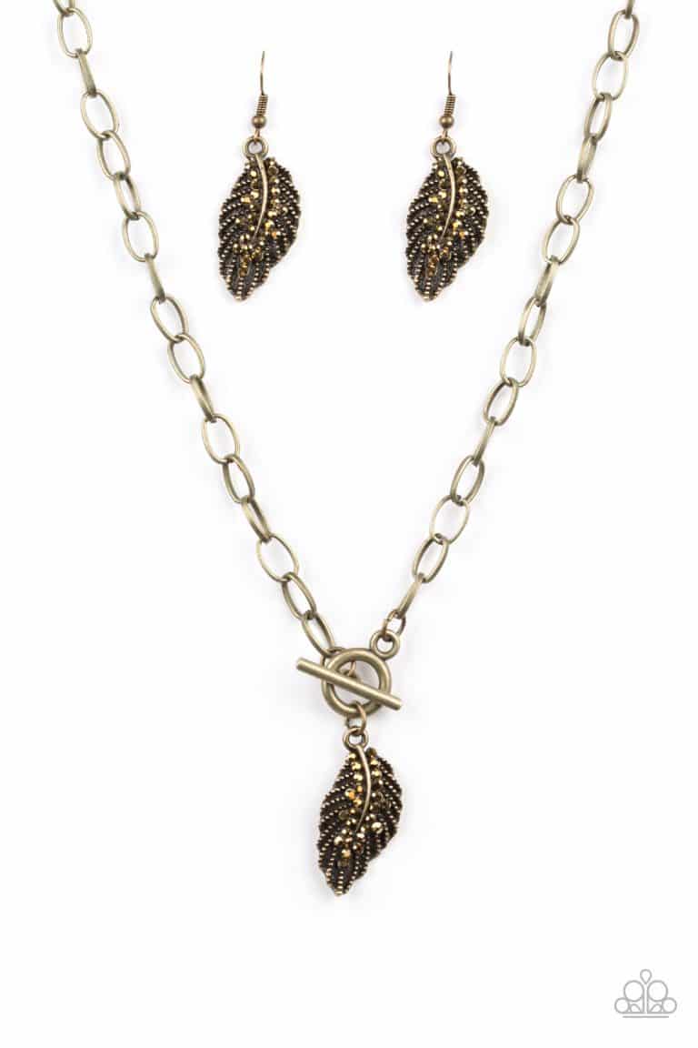Pilot Quest Brass. Glittery aurum rhinestones are sprinkled along a life-like brass feather pendant. The whimsical pendant swings from the bottom of a bulky brass chain below the collar for an edgy look. Features a toggle closure.