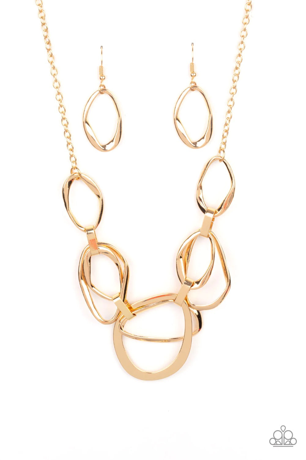 An asymmetrical assortment of twisted and flattened gold rings delicately link below the collar with oversized gold fittings, creating an intense industrial display below the collar. Features an adjustable clasp closure.