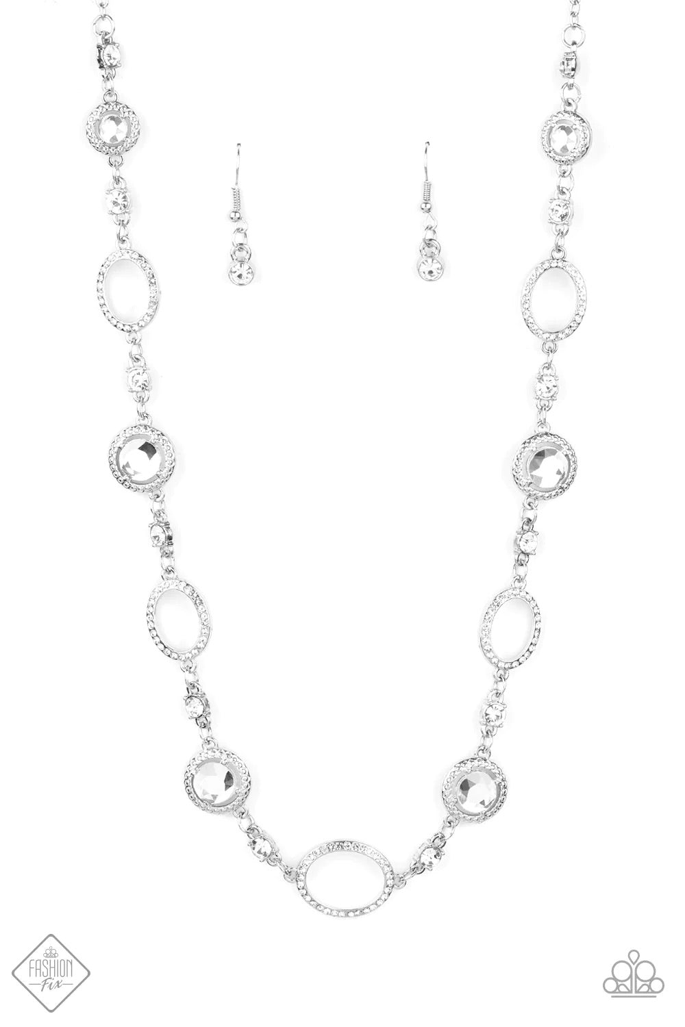 Solitaire rhinestones bordered by brilliant silver frames connect with smaller rhinestones and dainty rhinestone-encrusted rings to create an eye-catching display that sparkles along the neckline. Features an adjustable clasp closure.
