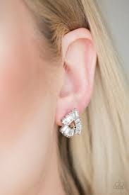 Featuring edgy emerald style cuts, radiant white rhinestones are encrusted along overlapping silver frames for a regal look. Earring attaches to a standard post fitting.