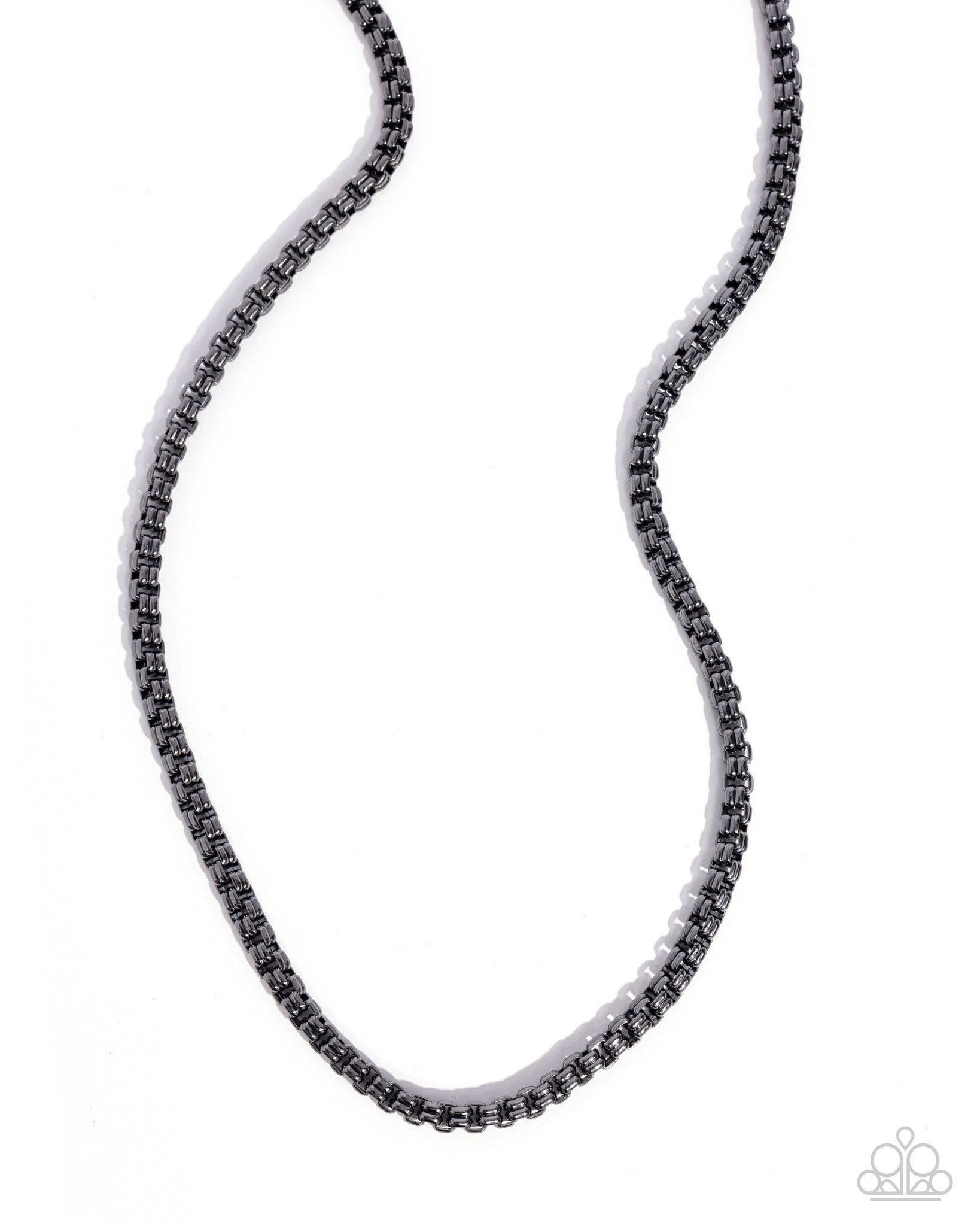 A double-stranded collection of glistening gunmetal box chains interconnect and link below the neckline for an alternative approach to attitude. Features an adjustable clasp closure.
