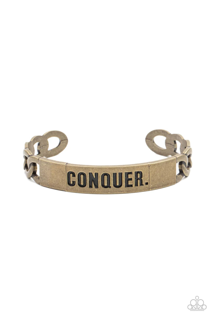 Brass chain-like bars attach to a rustic brass centerpiece stamped in the powerful word, "CONQUER," creating a statement-making cuff around the wrist.