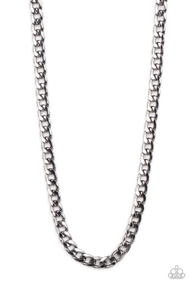 A thick gunmetal strand of curb chain drapes below the collar for a bold industrial look. Features an adjustable clasp closure.