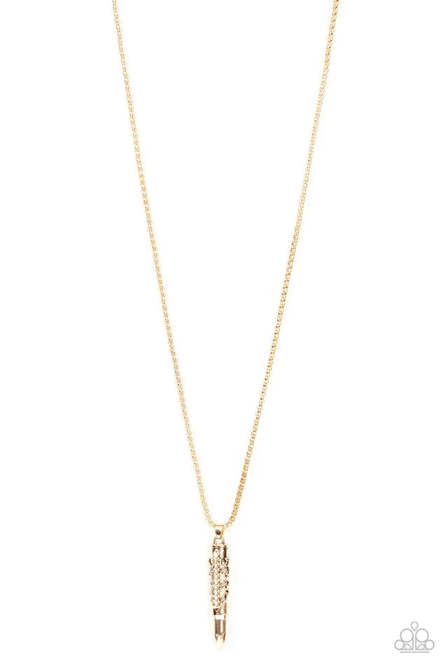 Wrapped in a tribal inspired motif, a shiny gold bullet-like pendant swings from the bottom of a rounded strand of gold box chain for a rugged look. Features an adjustable clasp closure