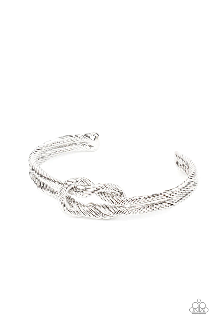 Gritty silver cable-like bars curl around the wrist, knotting into an edgy cuff for a bold industrial look.