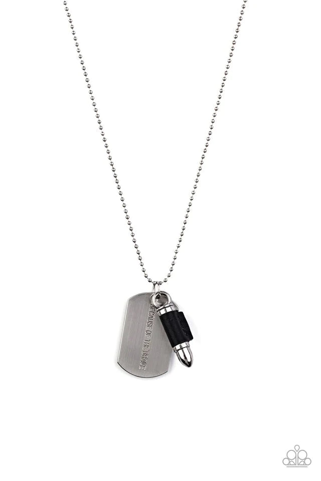 Pinched between a black leather fitting, a silver bullet pendant joins a silver dog tag at the bottom of a silver ball chain. The shimmery dog tag is stamped in the phrase, "Because of the Brave," for a patriotic finish. Features a ball and clasp closure.