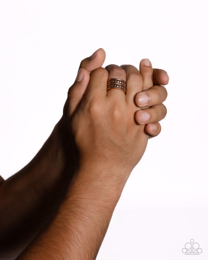 Brushed in an antiqued finish, two rows of faceted square studs stack across a copper band for a rustic look. Features a stretchy band for a flexible fit.