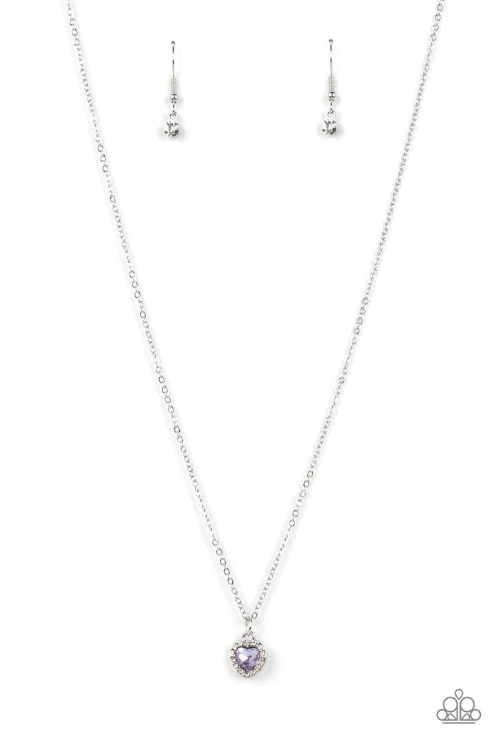 Bordered in glassy white rhinestones, a dainty purple rhinestone heart sparkles along a dainty silver chain below the collar for a flirtatious fashion. Features an adjustable clasp closure.