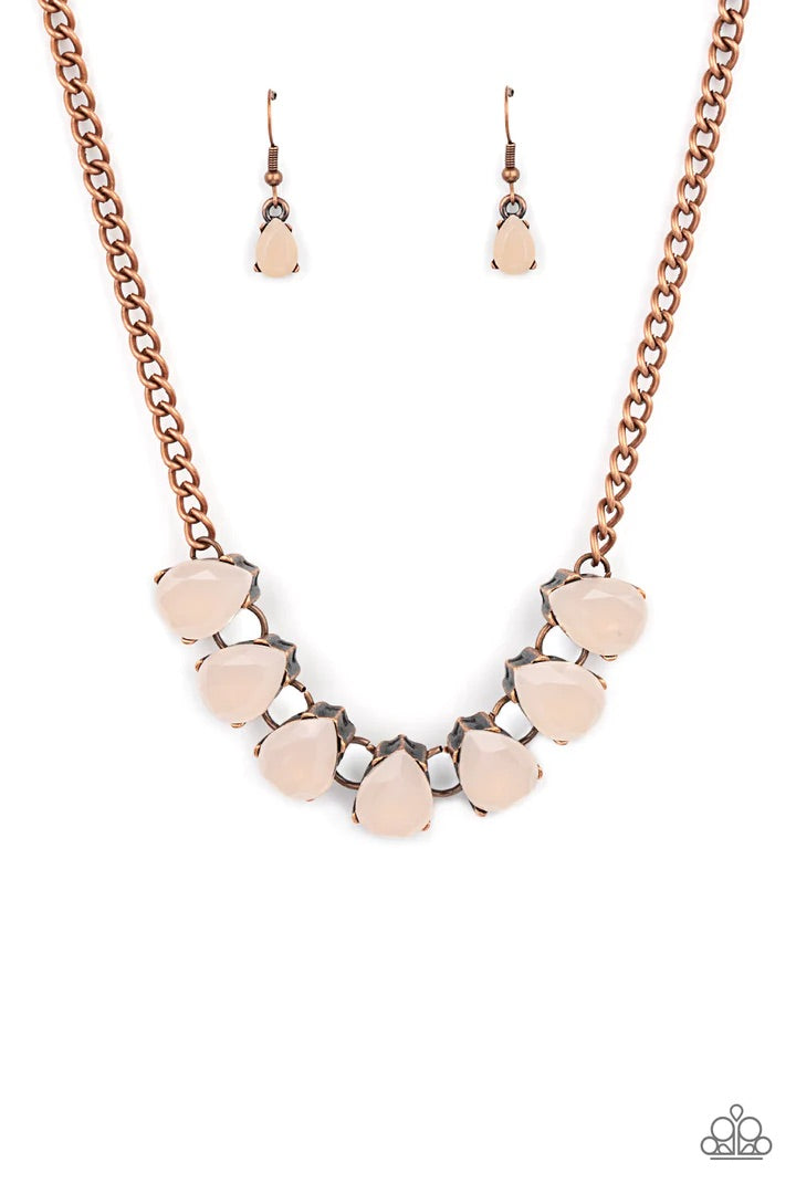 Attached to antiqued copper chains, a row of heavenly cloudy teardrop gems, set in pronged copper settings, line up across the collar in an angelic ambiance. Features an adjustable clasp closure.
