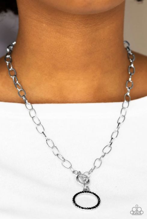 Encrusted in glittery black rhinestones, a bubbly silver pendant swings below the collar for a colorfully casual look. Features a toggle closure.
