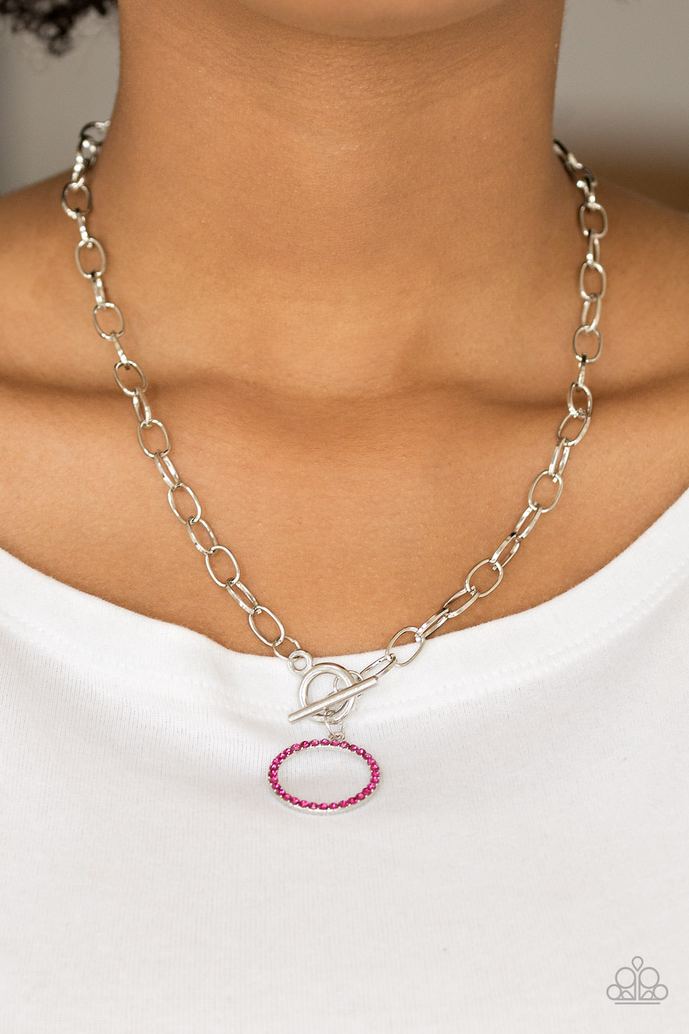Encrusted in glittery pink rhinestones, a bubbly silver pendant swings below the collar for a colorfully casual look. Features a toggle closure.