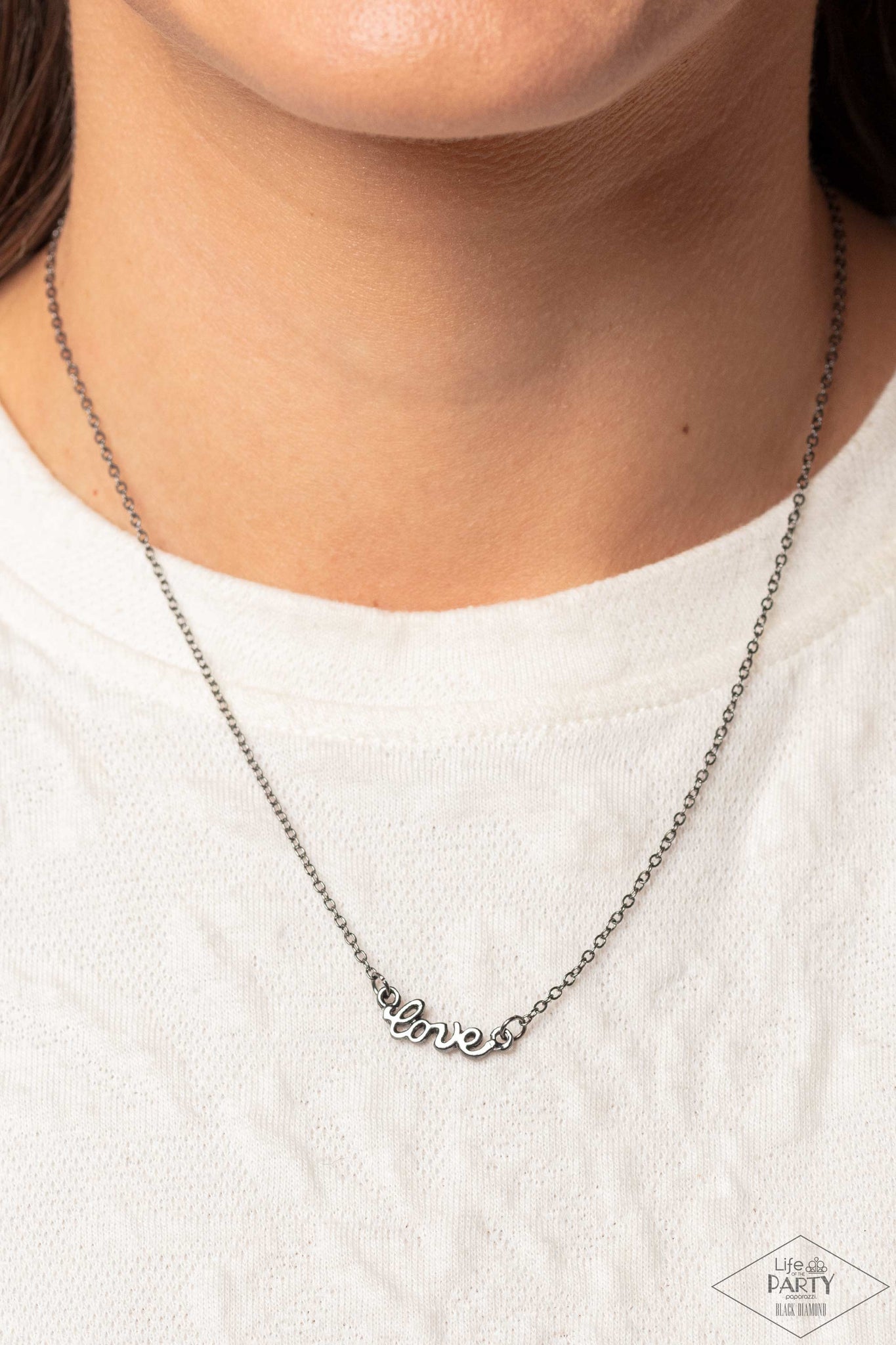 Brushed in a high-sheen shimmer, a glistening ribbon of gunmetal spells out the word “love” below the collar, creating a dainty pendant. Features an adjustable clasp closure.