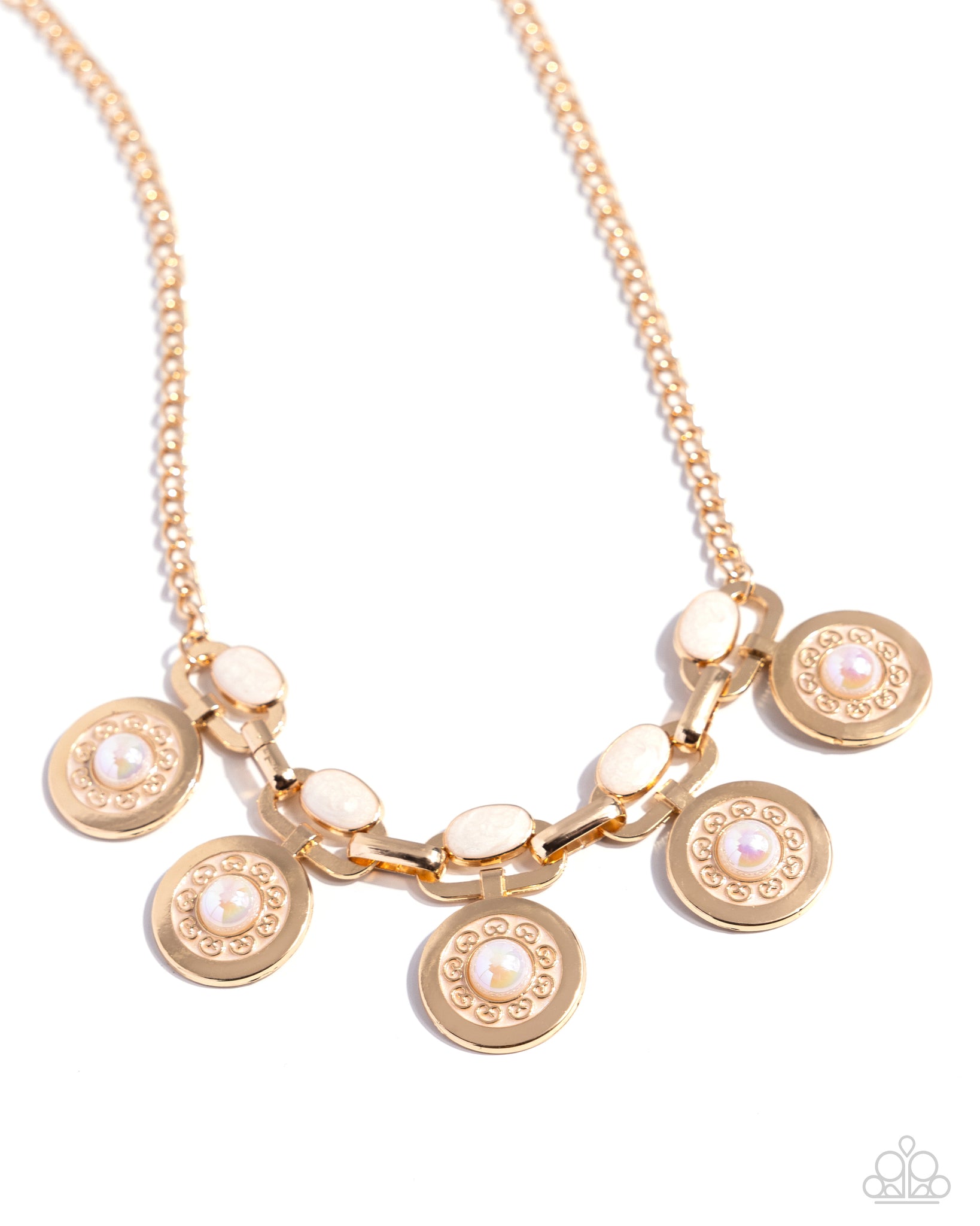 A gold chain connects to large gold rings that interconnect below the collar. Featuring ivory pearly paint, gold ovals glisten at the top of the rings for a hint of softness. Gold discs with iridescent pearl centers and ivory-painted detailing swing below the oversized jump rings for additional refinement. Features an adjustable clasp closure. Due to its prismatic palette, color may vary.