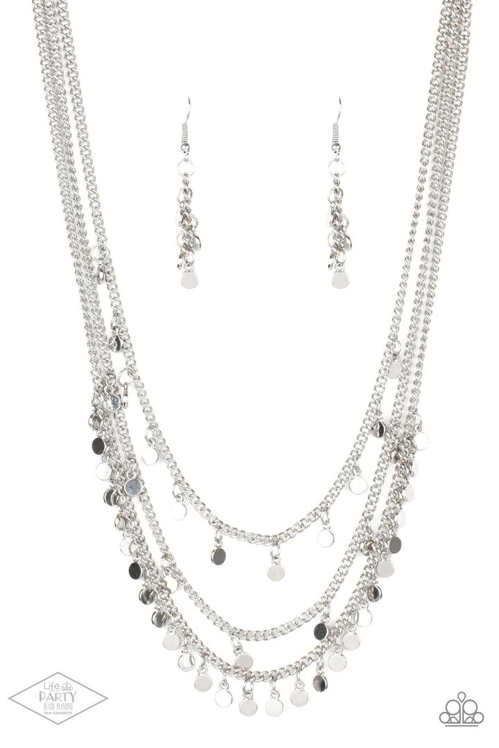 Shiny silver discs swing from three tiers of silver chains. The layered fringe falls just below the collar, creating a endless light-catching texture and movement. Features an adjustable clasp closure. Features an adjustable clasp closure.
