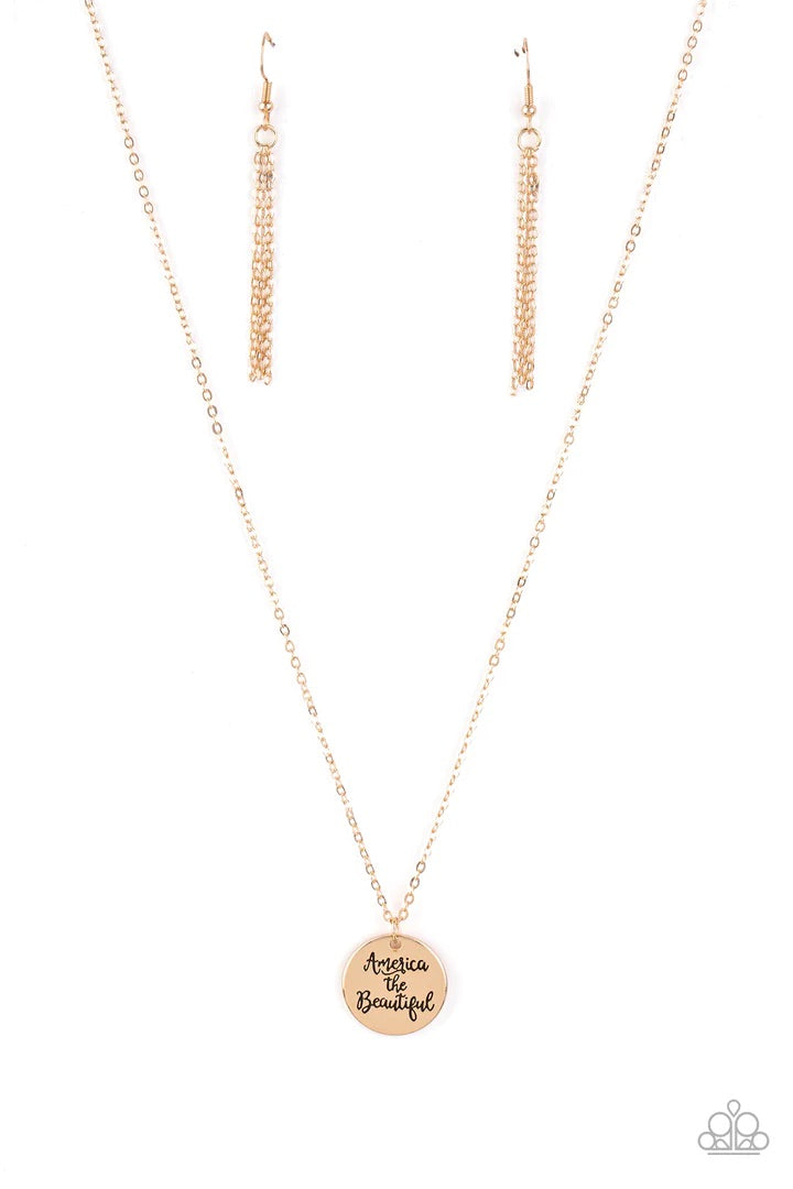 Stamped in the patriotic phrase, "America The Beautiful," a glistening gold disc slides along a dainty gold chain below the collar for a whimsical look. Features an adjustable clasp closure.