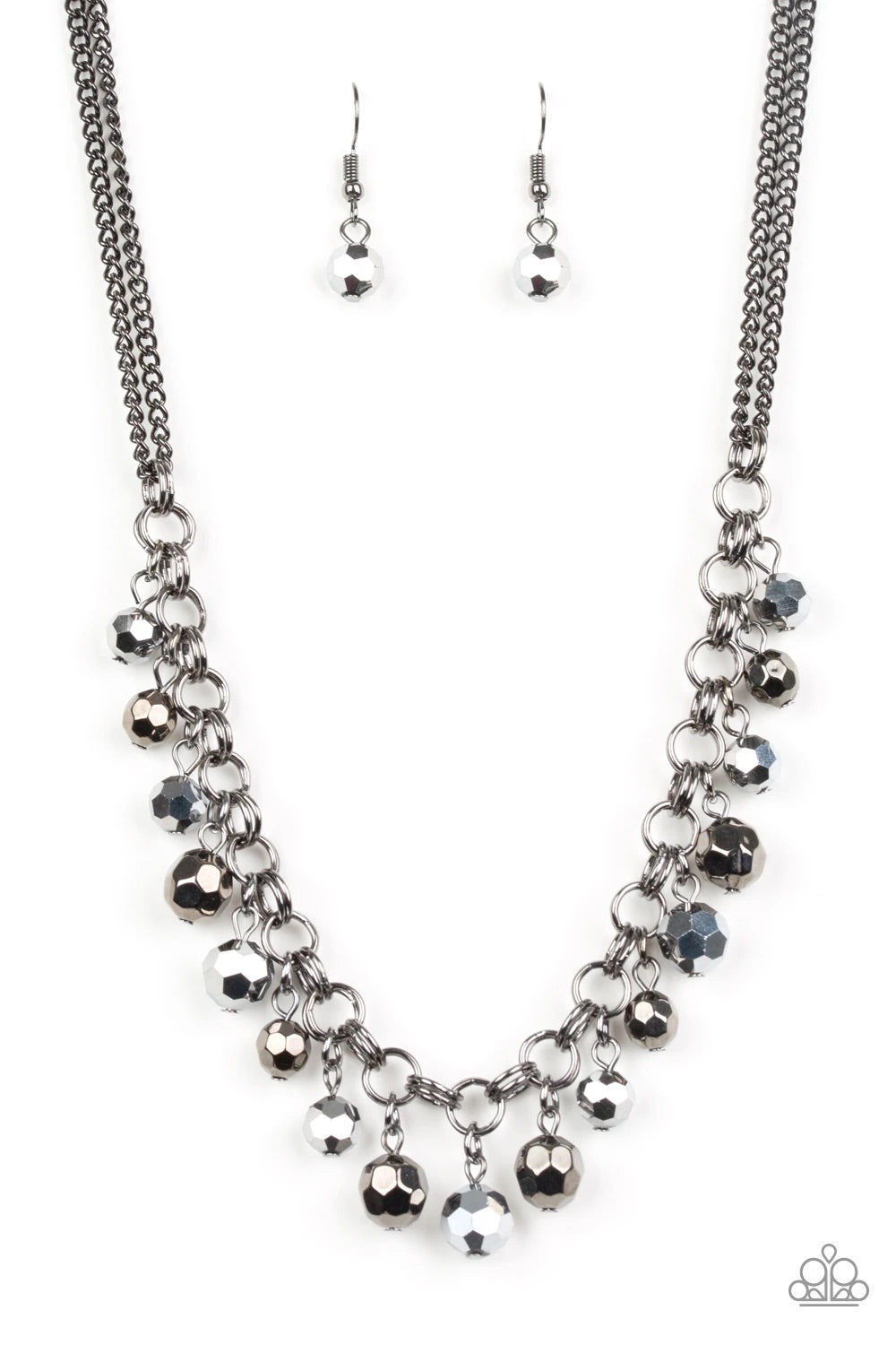 A collection of faceted gunmetal and hematite beads swing from the bottom of a double-link gunmetal chain, creating a blinding fringe below the collar. Features an adjustable clasp closure.