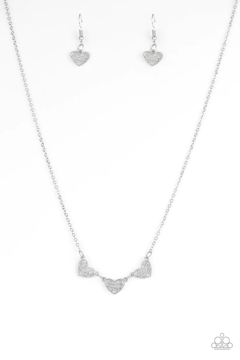 Featuring ornate filigree filled centers, a trio of dainty silver hearts link below the collar for a whimsical look. Features an adjustable clasp closure.