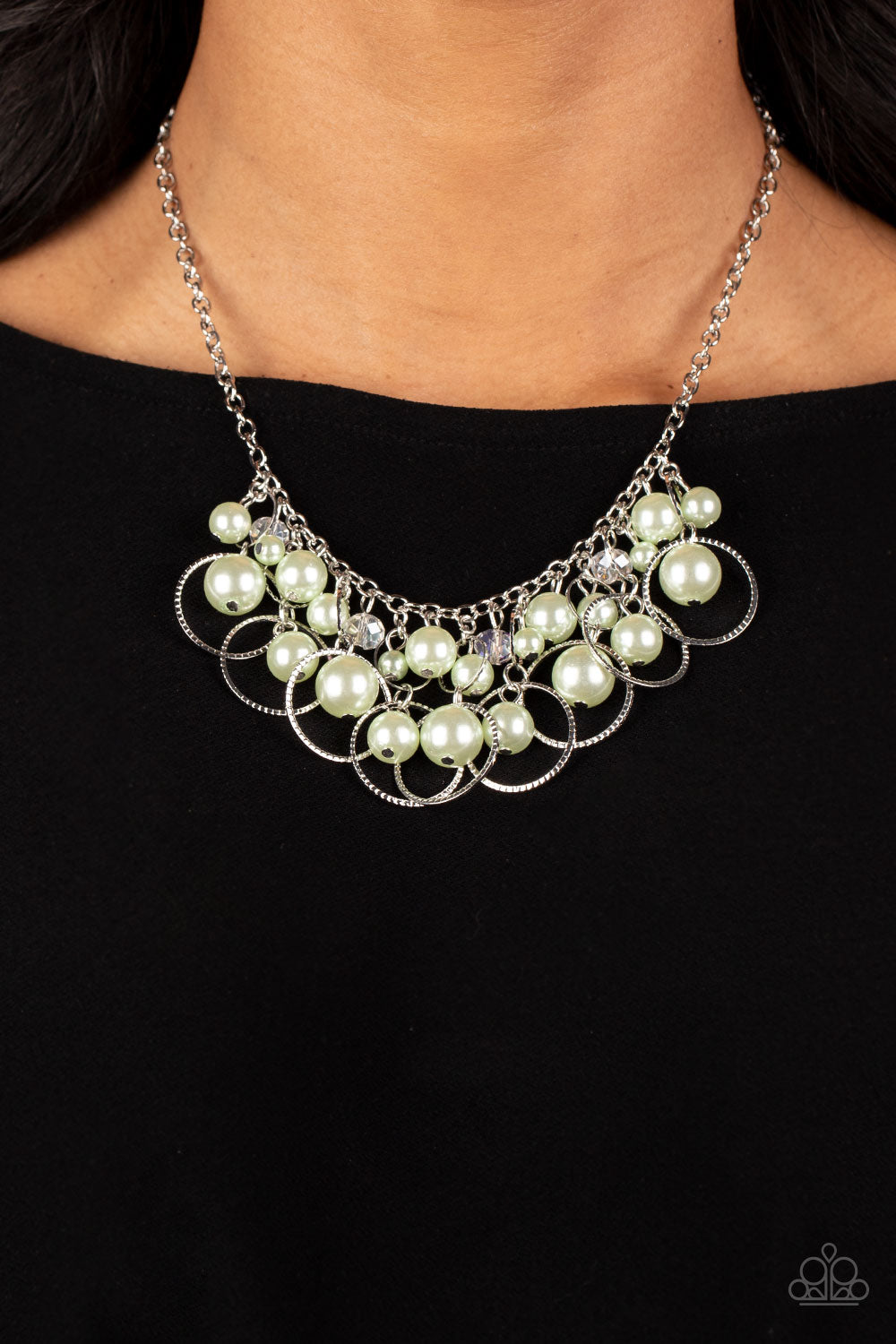 Set inside of and surrounded by alternating sizes of silver rings, staggered clusters of bubbly spearmint pearls and faceted clear crystal beads delicately link into a flirtatious hint of sparkle below the collar. Features an adjustable clasp closure.