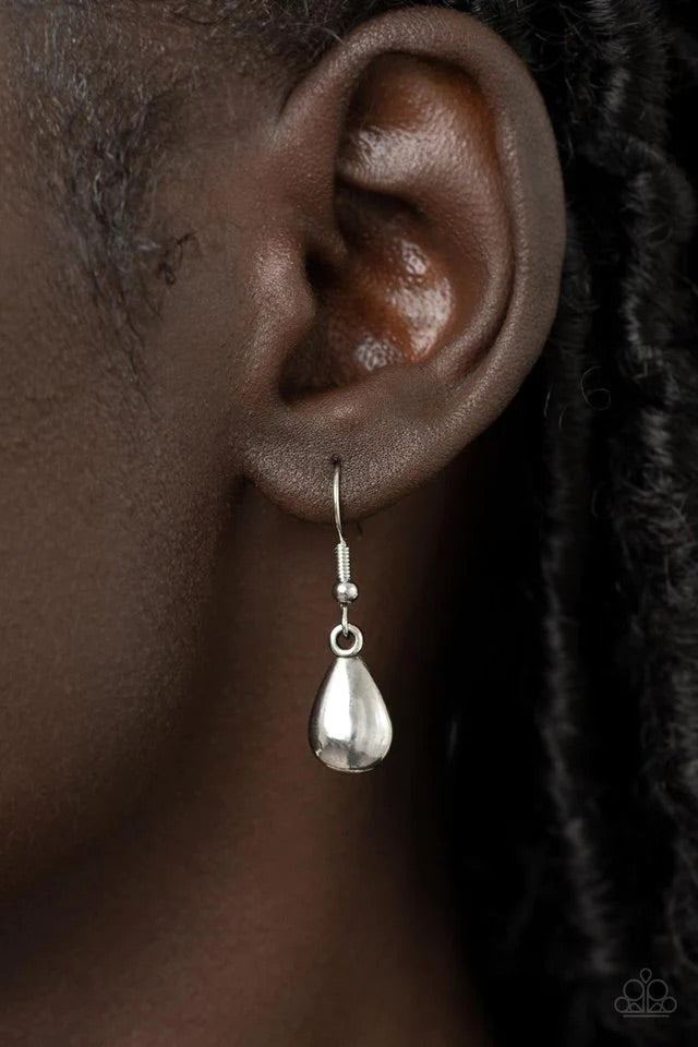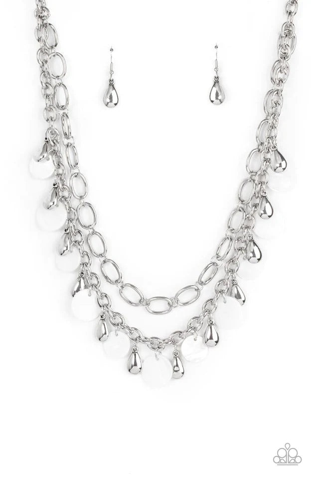 A pair of mismatched chunky silver chains layer below the collar. Shiny silver teardrop beads and white shell-like discs dance from the bottom of the lowermost chain, creating a tropical inspired fringe. Features an adjustable clasp closure.