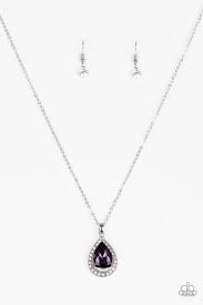 Featuring a regal teardrop cut, a glittery purple gem sits atop a silver frame encrusted in glassy white rhinestones. The royal pendant swings below the collar in a glamorous fashion. Features an adjustable clasp closure.