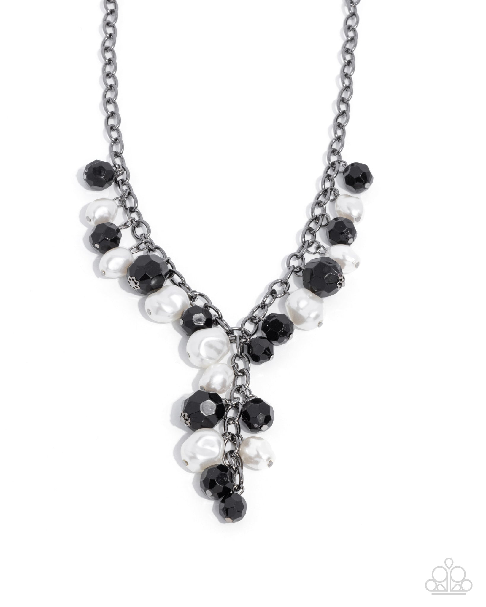 A mismatched collection of black beads in varying sizes and baroque white pearls in varying sizes dance and extend below the chest from a glistening gunmetal cable chain creating a socialite sensation. Features an adjustable clasp closure.