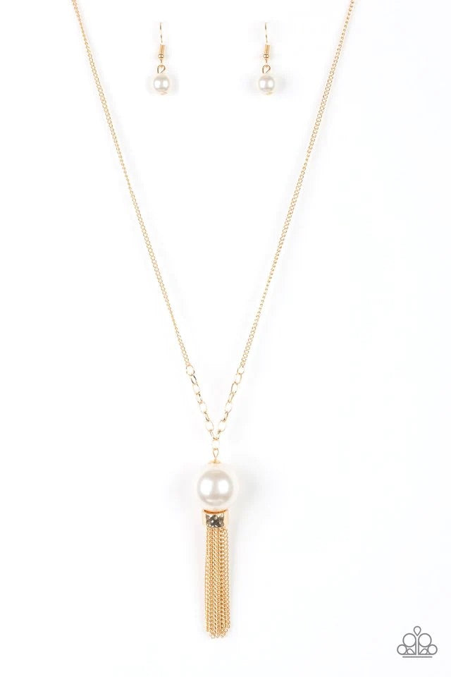 A dramatic pearly white bead swings from the bottom of an elegantly elongated gold chain. Featuring a hammered fitting, a gold tassel streams from the bottom of the colorful pendant for a refined finish. Features an adjustable clasp closure. Sold as one individual necklace. Includes one pair of matching earrings.