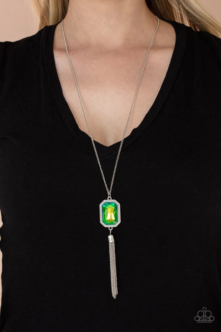 Featuring a UV shimmer, a faceted blue and green emerald cut gem is pressed into the center of a silver studded frame, creating an ethereal pop of color at the bottom of a lengthened silver chain. A silver chain tassel swings from the bottom of the pendant, adding flirtatious movement to the opulent display. Features an adjustable clasp closure.