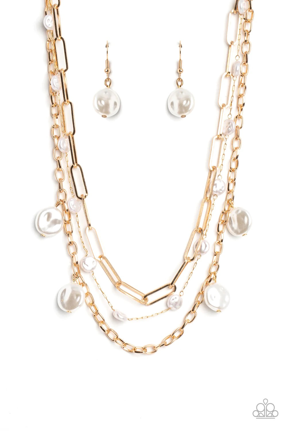 Infused with a dainty gold chain, flattened baroque pearls sporadically trickle along shimmery gold paperclip chains in varying sizes, creating refined layers down the chest. Sporadically hanging from the daintier paperclip chain, oversized pearls in the same flattened finish create additional light-reflecting sheen. Features an adjustable clasp closure.