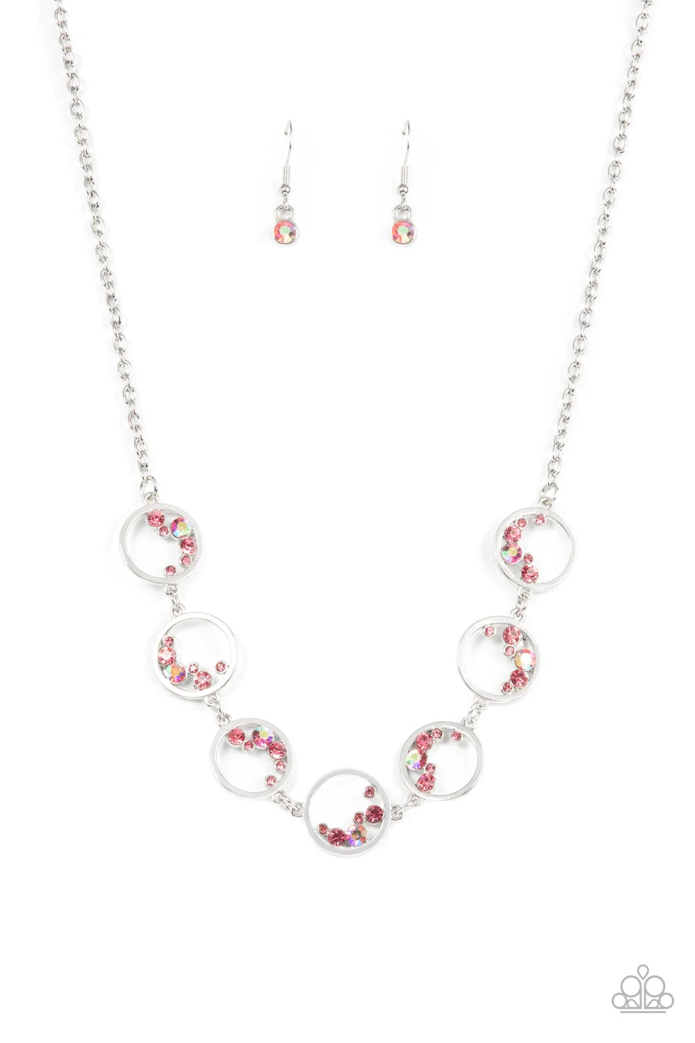 A dainty series of shiny silver rings are sporadically dotted in bubbly rows of glassy and iridescent pink rhinestones as they delicately link below the collar, resulting in an effervescent display. Features an adjustable clasp closure.