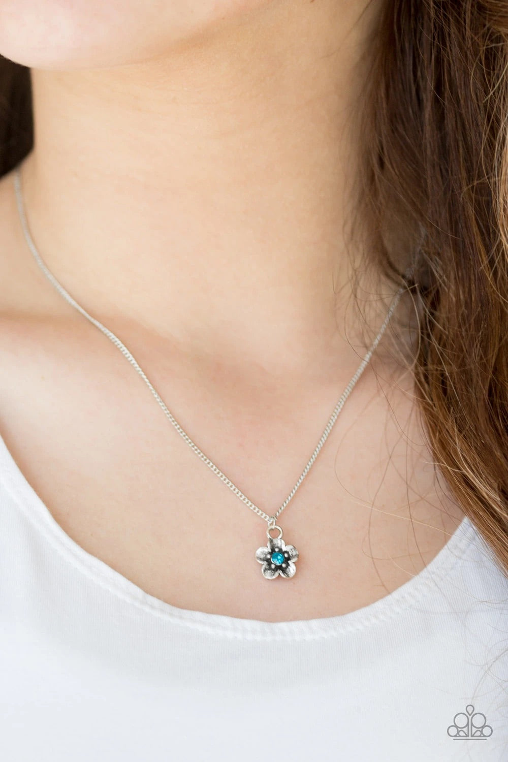 A glittery blue rhinestone is pressed into the center of a dainty silver daisy, creating a whimsical pendant below the collar. Features an adjustable clasp closure.