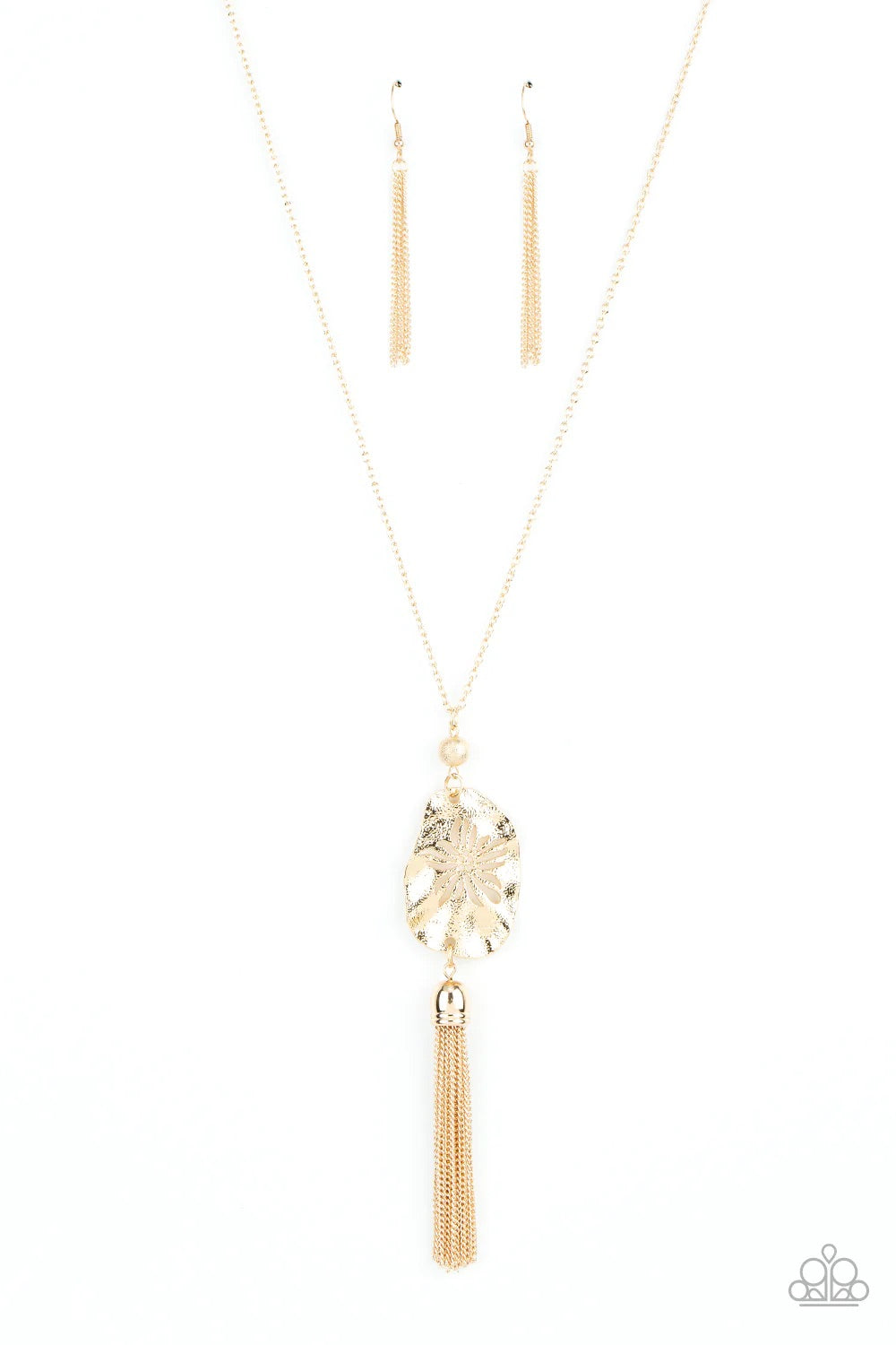 Stenciled in an airy floral design, a hammered gold plate swings between a gold bead and gold chain tassel at the bottom of a classic gold chain for a seasonal fashion. Features an adjustable clasp closure.