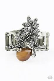 Encrusted in white rhinestones, leafy gold bars wrap across the finger, creating a seasonal band. A luminescent teardrop moonstone adorns the band for a whimsical finish. Features a stretchy band for a flexible fit. Sold as one individual ring.