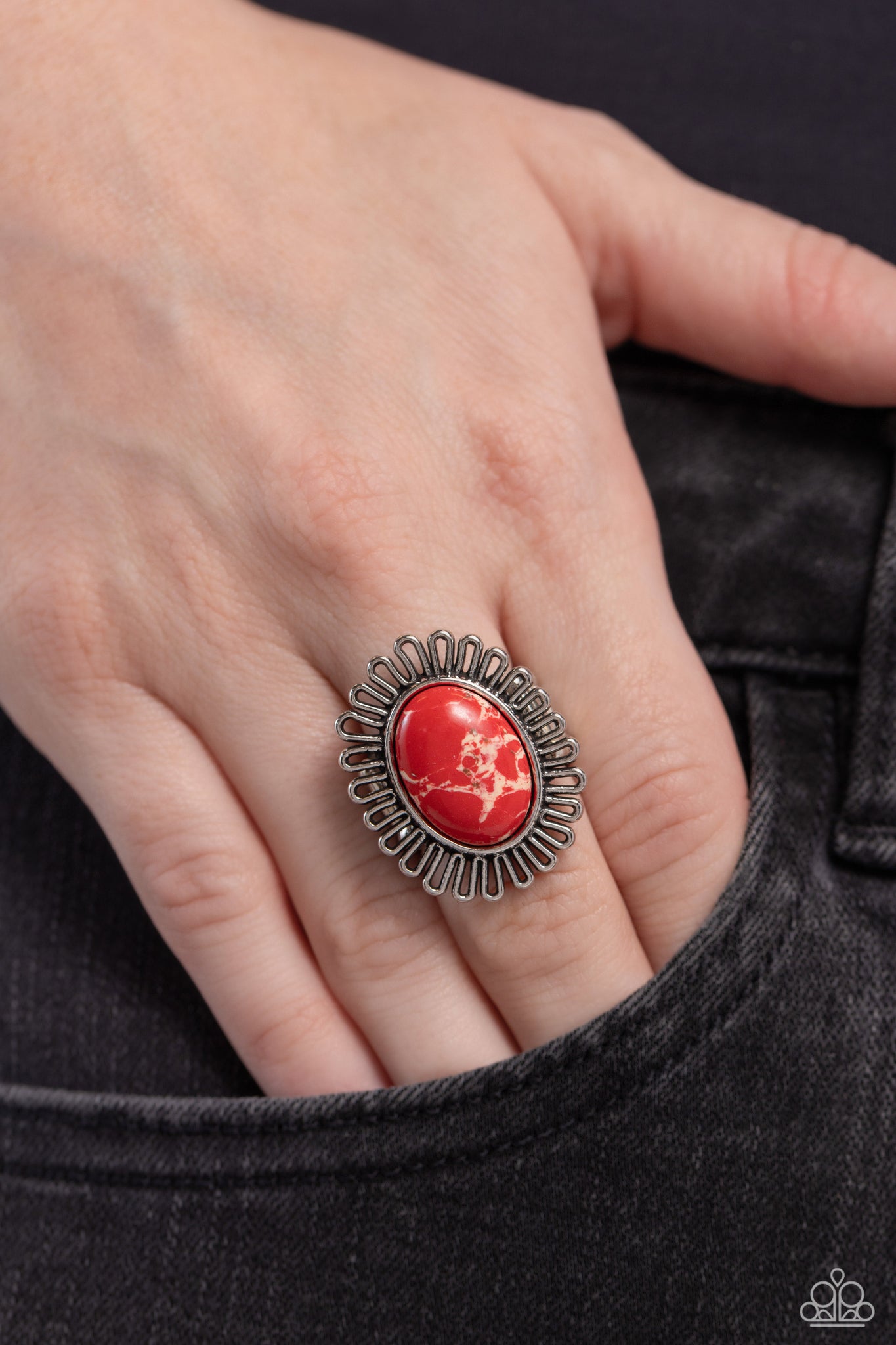 Rustic silver petals loop around a fiery red stone center, creating an artisan inspired floral centerpiece atop the finger. Features a stretchy band for a flexible fit.