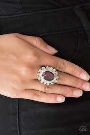Encrusted in dainty white rhinestones, a frilly silver frame spins around a glowing purple moonstone center for a regal look. Features a stretchy band for a flexible fit.