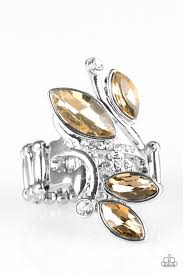 Glassy brown marquise-cut gems are pressed into a silver foliage pattern. White rhinestones are sprinkled across the leafy frame, adding classic shimmer to the refined piece. Features a stretchy band for a flexible fit.