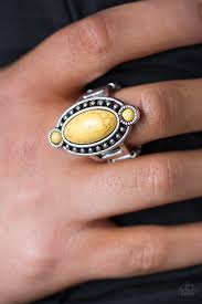 Sunny yellow stones are pressed into a studded silver frame, creating a southwestern inspired centerpiece. Features a stretchy band for a flexible fit.