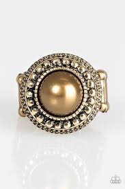 A pearly brass bead is pressed into the center of a stacked brass frame. Infused with classic brass studs and filigree detail, faceted brass studs spin around the pearly center, adding edgy shimmer to the dramatic centerpiece. Features a stretchy band for a flexible fit.