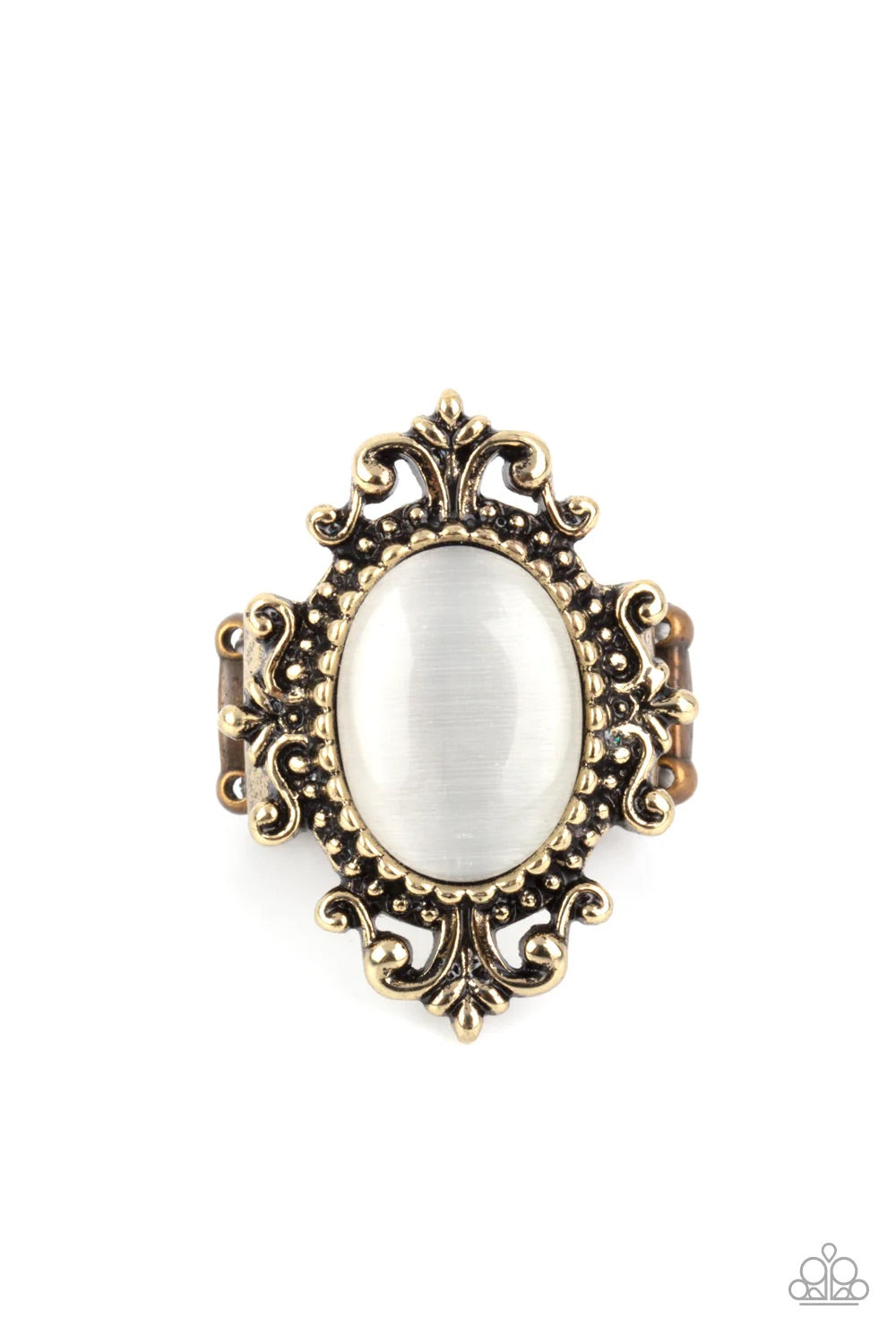An icy white cat's eye stone is pressed into the center of an ornately studded brass frame, creating a mystical pop of color atop the finger. Features a stretchy band for a flexible fit.
