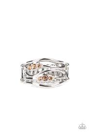 Trios of glittery topaz rhinestones are encrusted along wavy silver bands, creating refined layers. Features a stretchy band for a flexible fit.