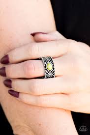 An earthy green bead is pressed into the center of a silver band radiating with tribal inspired textures for a seasonal look. Features a stretchy band for a flexible fit.