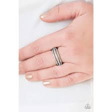 Dainty silver bands layer across the finger. The centermost band is encrusted in white rhinestones for a glamorous finish. Features a dainty stretchy band for a flexible fit.