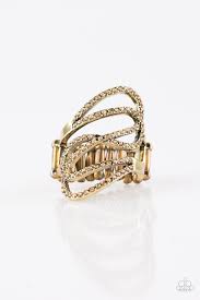 Encrusted in golden topaz rhinestones, sparkling brass ribbons swoop across the finger for a refined look. Features a stretchy band for a flexible fit.