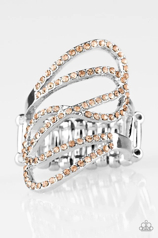 Encrusted in golden topaz rhinestones, sparkling silver ribbons swoop across the finger for a refined look. Features a stretchy band for a flexible fit. Sold as one individual ring.