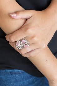 Glistening silver bars sway across the finger, coalescing into an airy band. Glittery white rhinestones and glowing pink moonstones are sprinkled along the wavy bands for a refined finish. Features a stretchy band for a flexible fit.